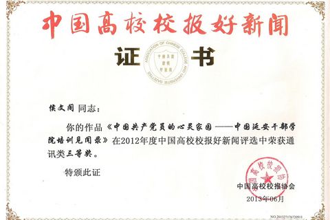 经中国高校校报协会中国高校校报好新闻评委会的评审,2012年度中国高校校报好新闻评选结果已揭晓。 据中国高校校报协会文件(中高报协[2013]3号),《陕西党校报》主任编辑、记者侯文阁年度新闻作品《中国共产党员的心灵家园——中国延安干部学院培训见闻录》(刊于《陕西党校报》2012年5月30日)荣获2012年度中国高校校报好新闻通讯类三等奖,并受到通报表彰。这是该篇通讯继荣获2012年度“陕西高校新闻奖”通讯类一等奖之后,又获得的全国性新闻奖项。该篇通讯在2012年6月先后被人民网,中国共产党新闻网、历史网,环球网等各大网站转载。