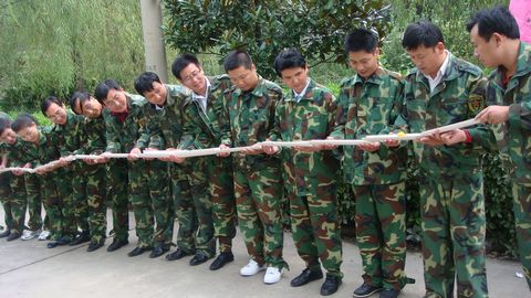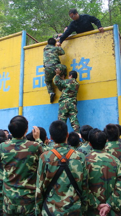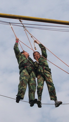 在训练班上,40名参训人员饶有兴致地听教员讲解拓展训练的目的和意义,所有人员分为“华山”和“猛虎”两队。在队长的带领下完成了高空跨断桥、高空走钢丝、流程管理等科目。最后,大家密切配合、团结一致,集体翻越了4.5m高的“毕业墙”绝壁求生项目。此刻,队员们相互拥抱表达自己内心无比激动的心情,在共同唱响一曲《朋友》的歌声中结束了整个训练。